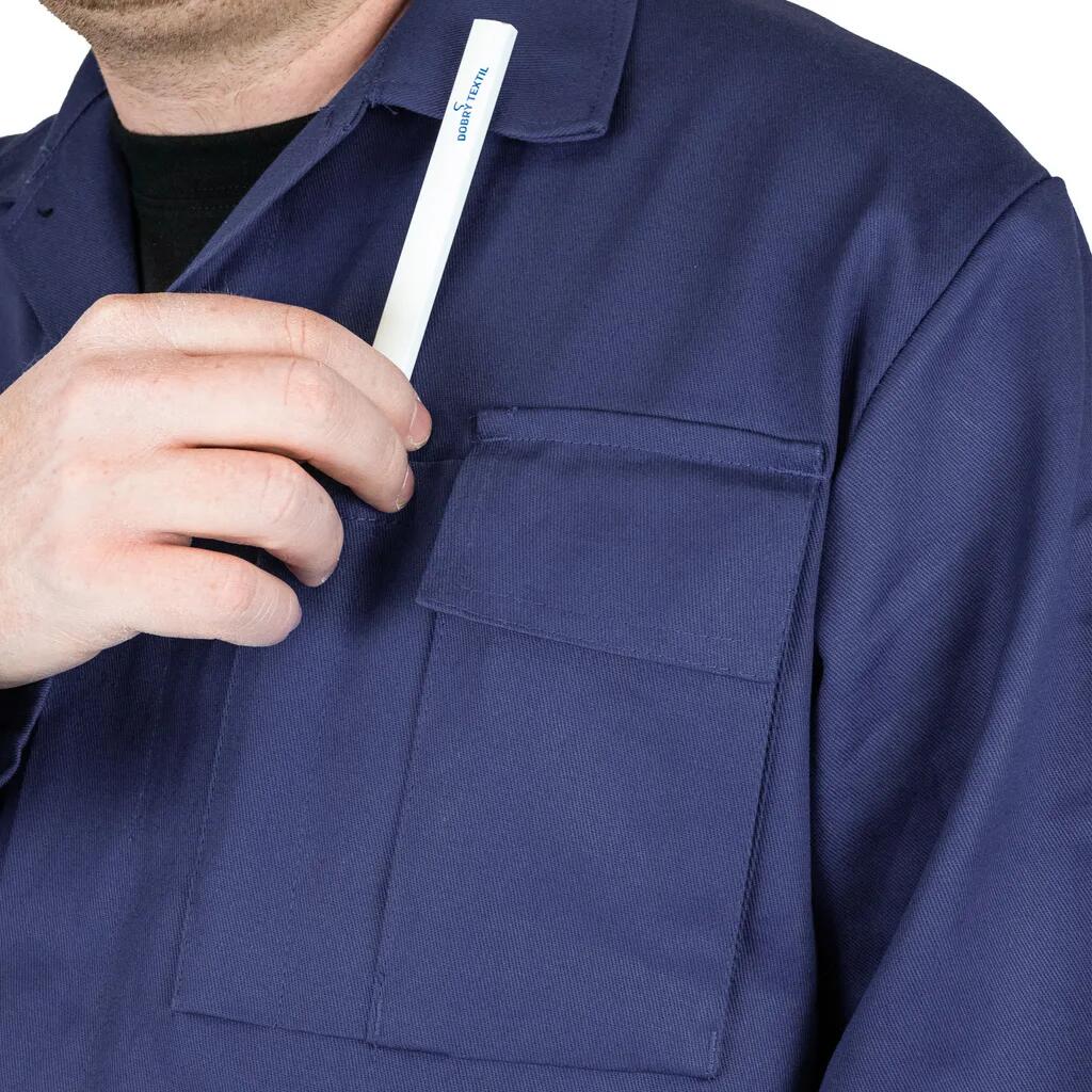 Jachetă de lucru din doc, 100% bumbac, 240 gsm, cu cusături duble la coate, închidere ascunsă și buzunar la piept cu Velcro.