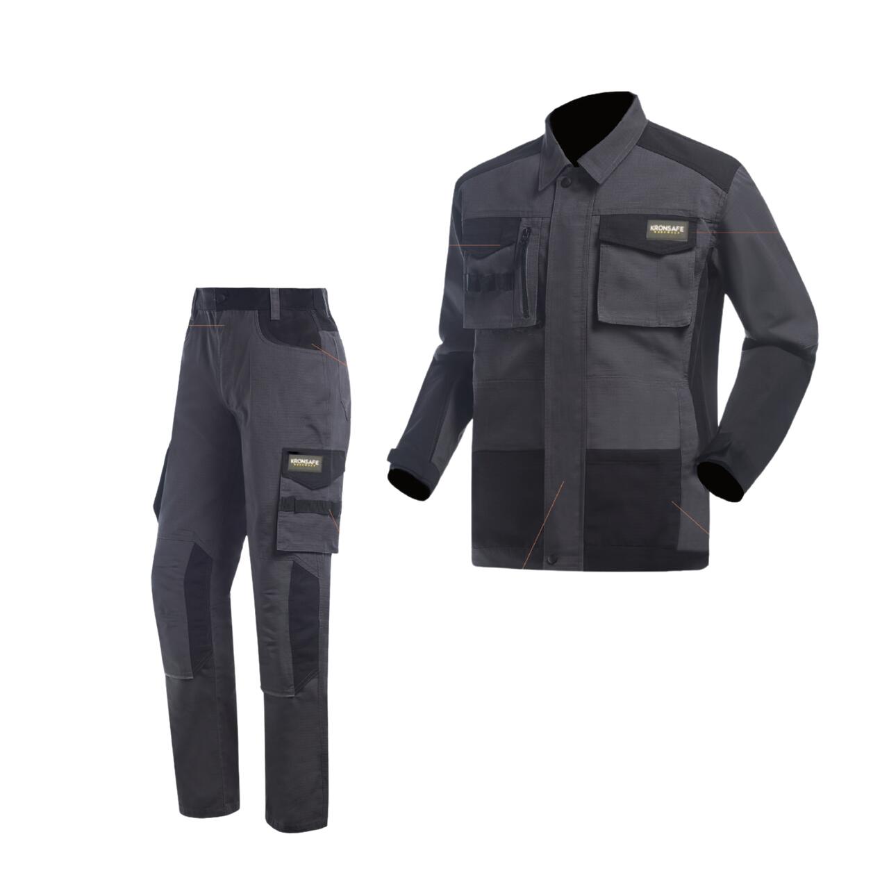 Costum de lucru alcătuit din jachetă de lucru și pantaloni pe talie, cu inserții reflectorizante, realizați din 65% poliester și 35% bumbac, cu o densitate de 280 gsm, intaritura ripstop și inchidere cu fermoar.