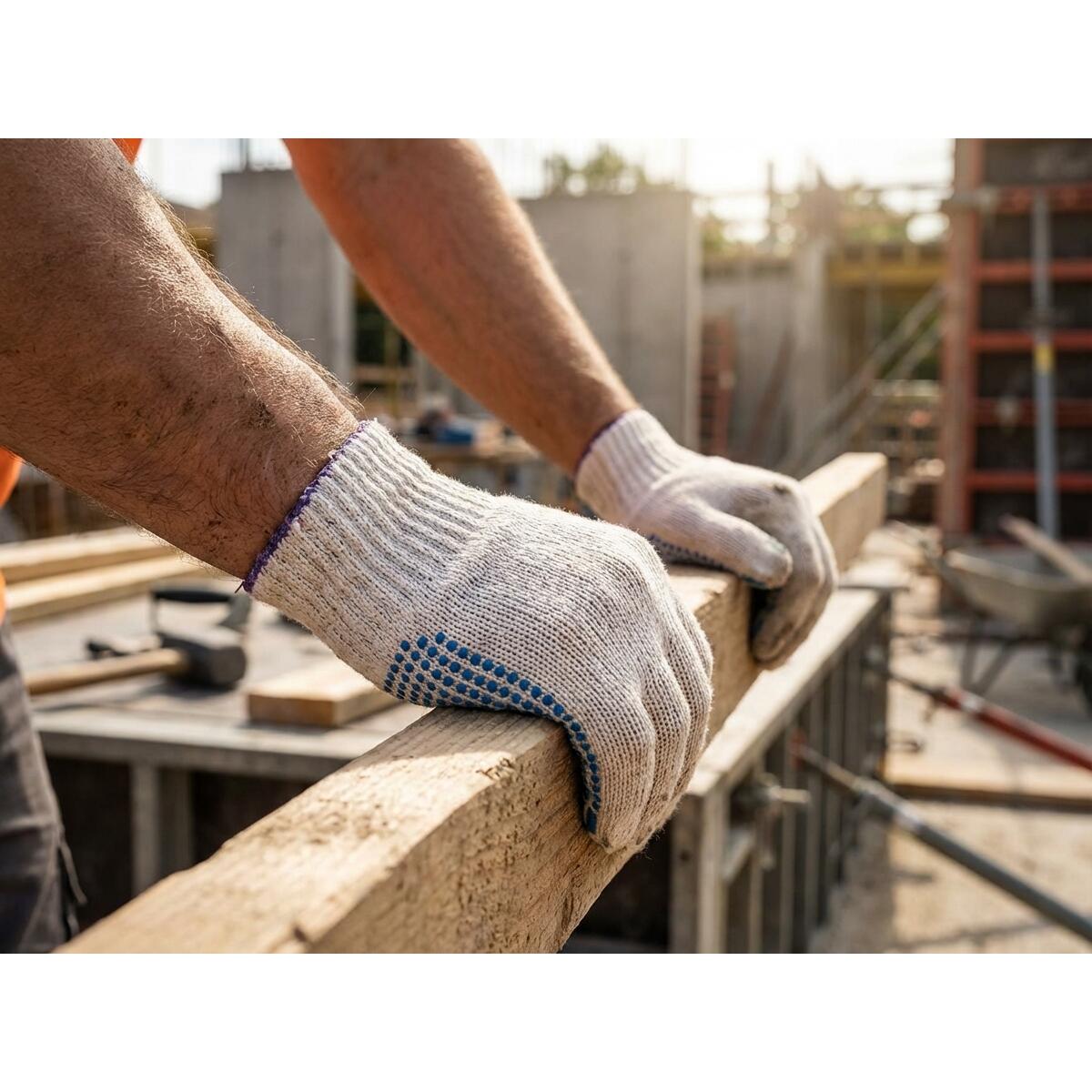 Mănuși de lucru din bumbac cu picouri, PVC pe palmă, concepute pentru a oferi protecție de bază, aderență bună și confort în activități zilnice cu riscuri reduse. Realizate din bumbac natural, acestea permit pielii să respire și asigură o purtare confortabilă chiar și pe durate mai lungi de utilizare.