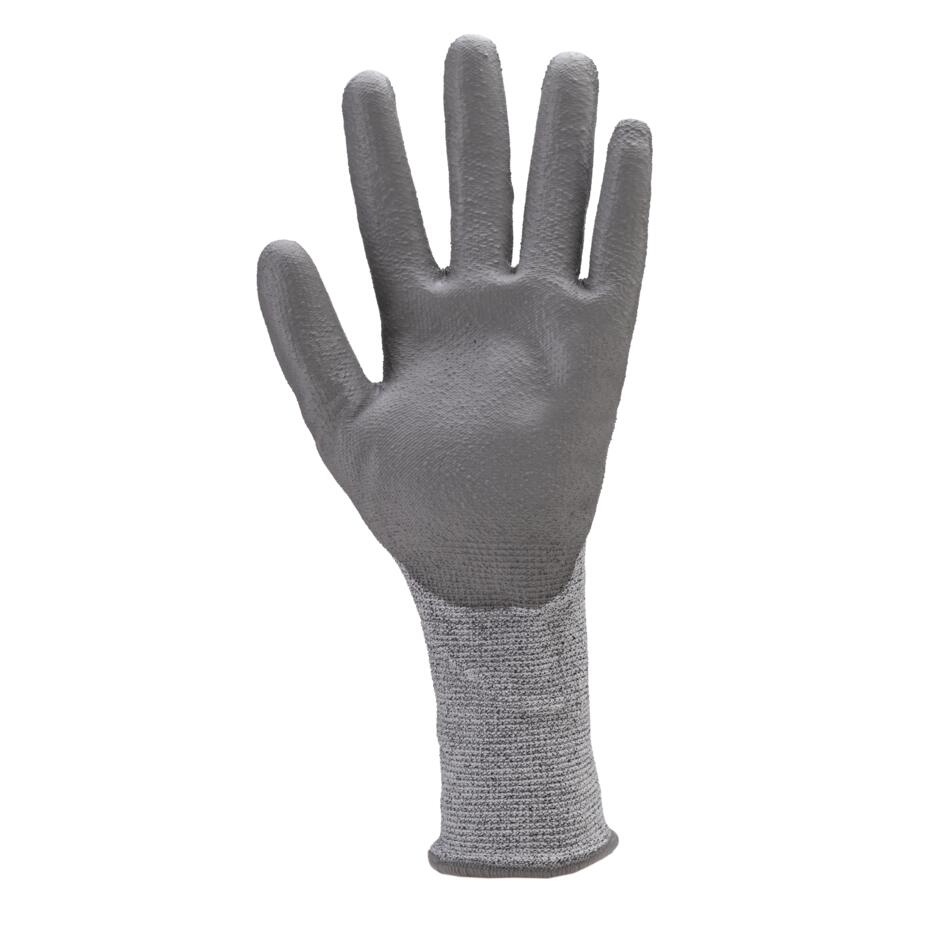 Mănuși de protecție pentru rezistență maximă la rupere, abraziune și tăieturi (TDM). Realizate din tricot multifibră (HDPA cu bază de poliester), ac 13, oferă protecție sporită și durabilitate în utilizare. Palma este acoperită cu un strat de poliuretan (PU) gri, rezistent la abraziune. Recomandate pentru lucrul în medii uscate, unde este necesară dexteritate și protecție mecanică ridicată.