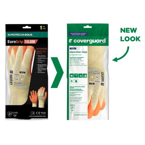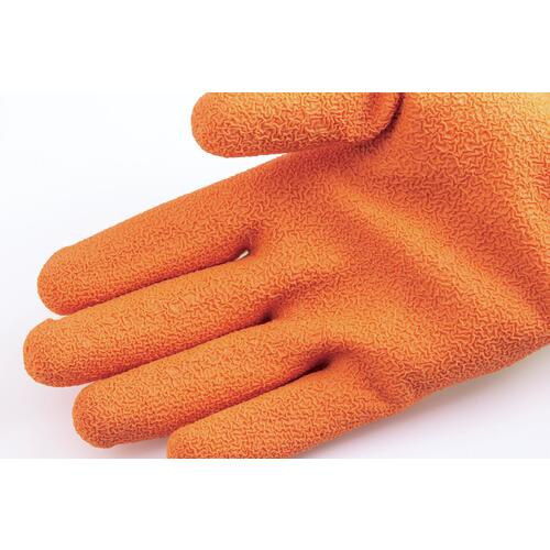 Mănuși de protecție antiderapante, confecționate din tricot de 10 din poliester galben, imersate în latex portocaliu pe palmă și degete pentru aderență excelentă, chiar și în medii umede sau uscate. Oferă protecție maximă la rupere, au spate ventilat pentru respirabilitate și manșetă elastică pentru o fixare sigură și confortabilă.
