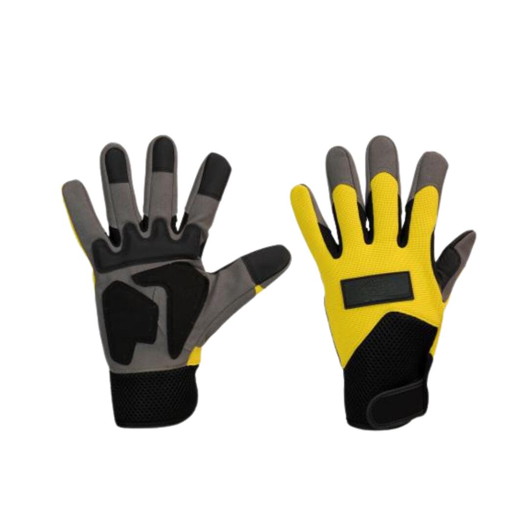 Mănuși de protecție din piele sintetică, cu fibre stretch-spandex, închidere cu velcro și vârful degetelor tip touch screen.