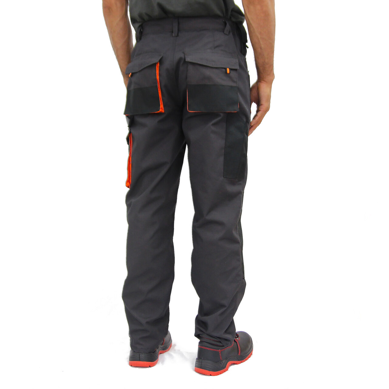 Pantaloni de lucru Classic, in talie, din tercot 270 g/mp, gri-negru, cu insertii portocalii, buzunare multiple, cusaturi triple si intarituri suplimentare in zonele expuse la rupere, prevazuti cu 2 spatii pentru genunchiere.