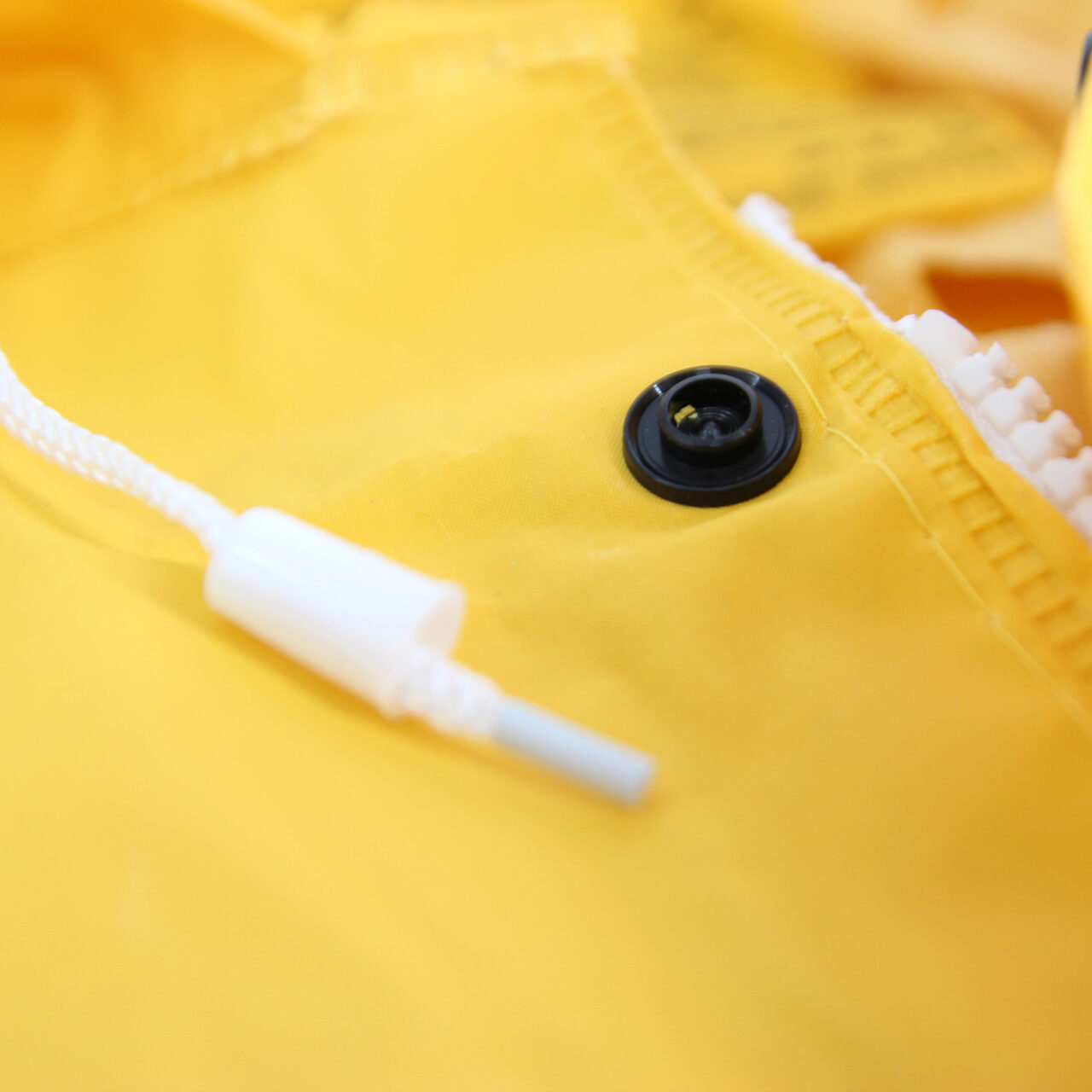 Pelerină de ploaie impermeabilă cu glugă, capse și două buzunare laterale.