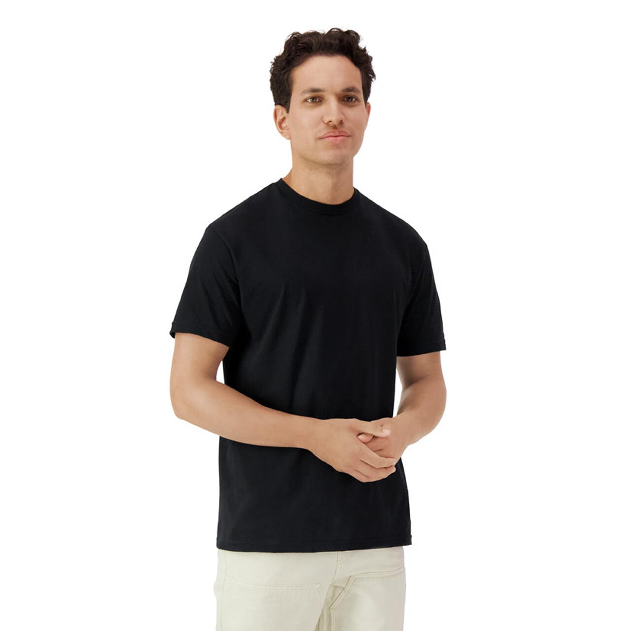 Tricou din bumbac organic (156–159 g/mp), cu țesătură de înaltă densitate, oferă o suprafață netedă perfectă pentru imprimare. Vopsit cu coloranți OEKO-TEX, prietenos cu mediul. Dispune de guler îngust rib, cusături ranforsate la gât și umeri și croială modern-clasică fără cusături laterale.