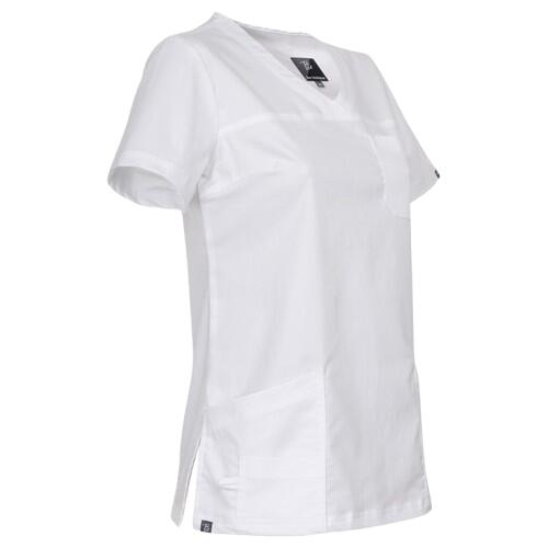 Tunică din 53% bumbac, 44% poliester și 3% spandex (160 g/mp), oferind confort și libertate de mișcare. Design modern cu decolteu în V și fante laterale, asigurând lejeritate și flexibilitate optimă.